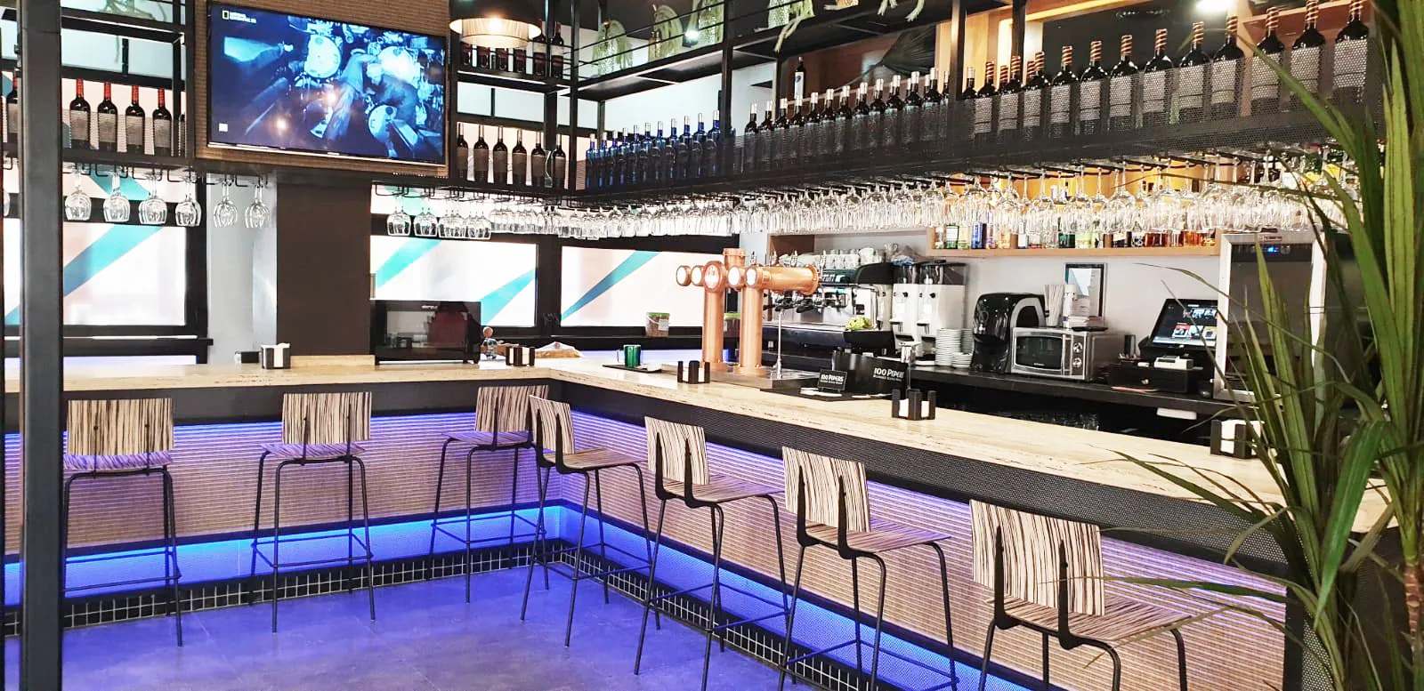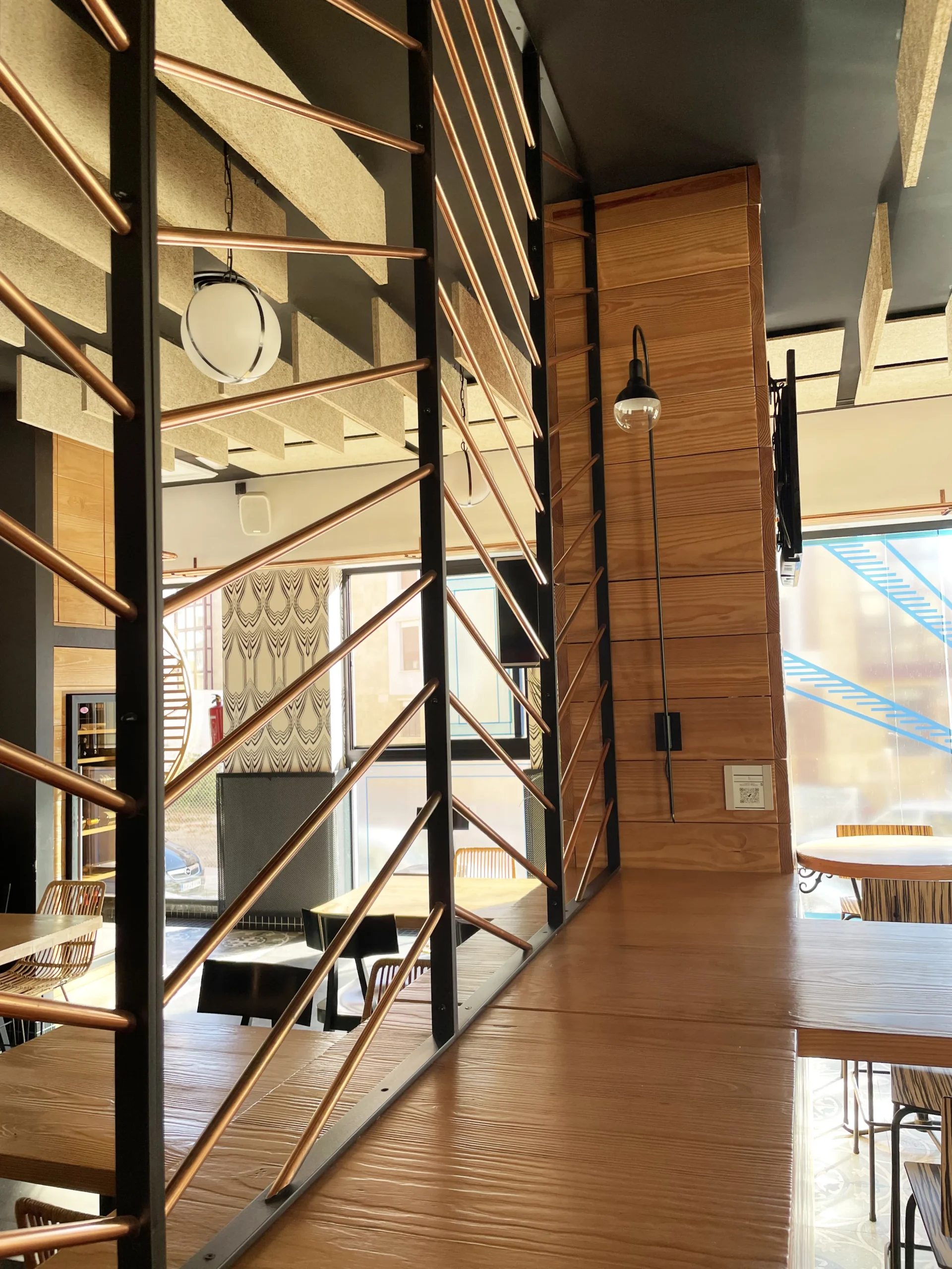 Se diseñaron unas cañerías de cobre que giran por todo el local, como si la cerveza recorriese por el techo del mismo, generando así una conexión visual entre todas sus zonas.