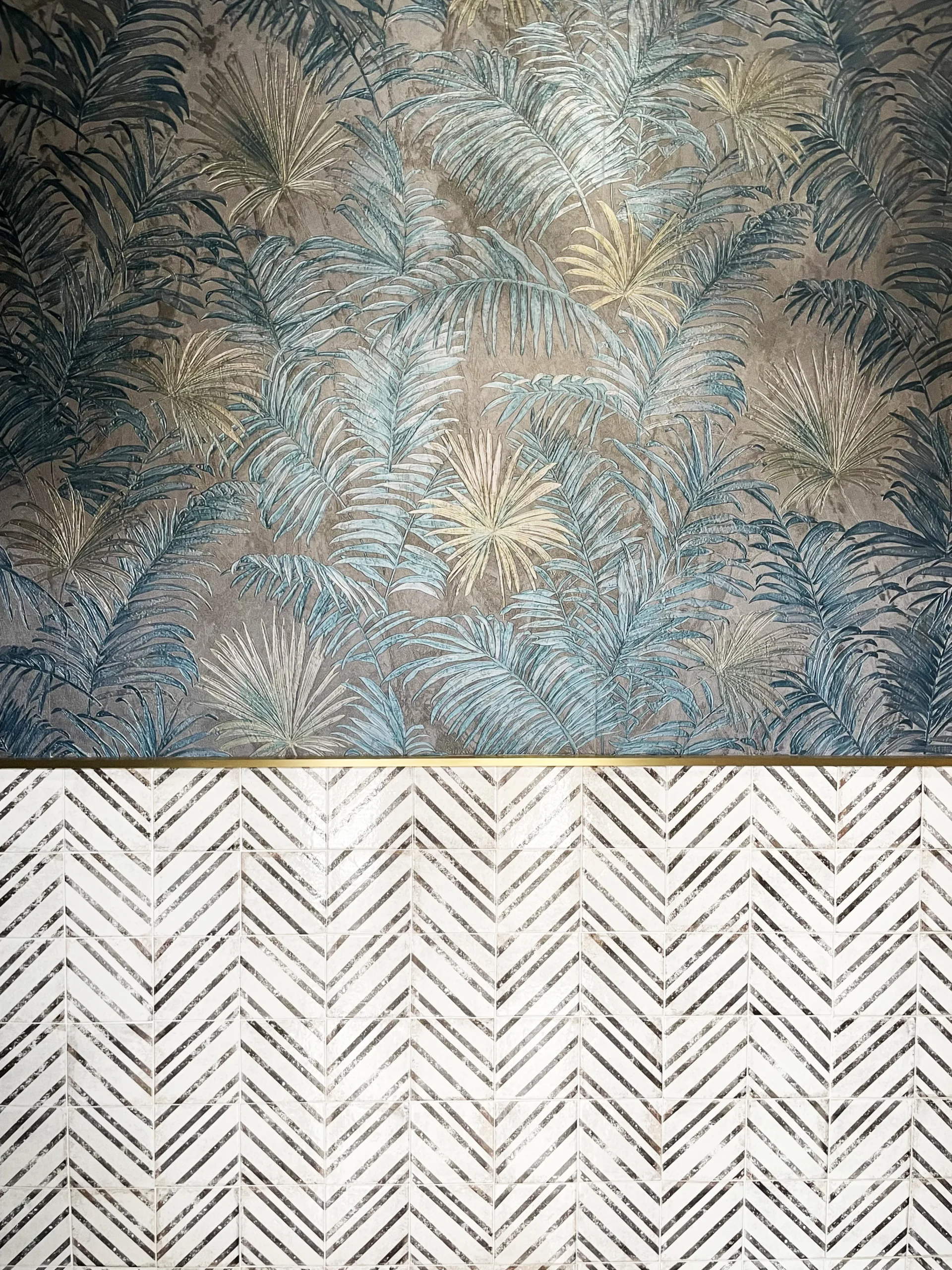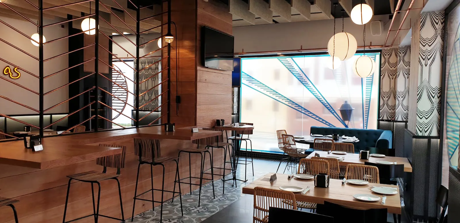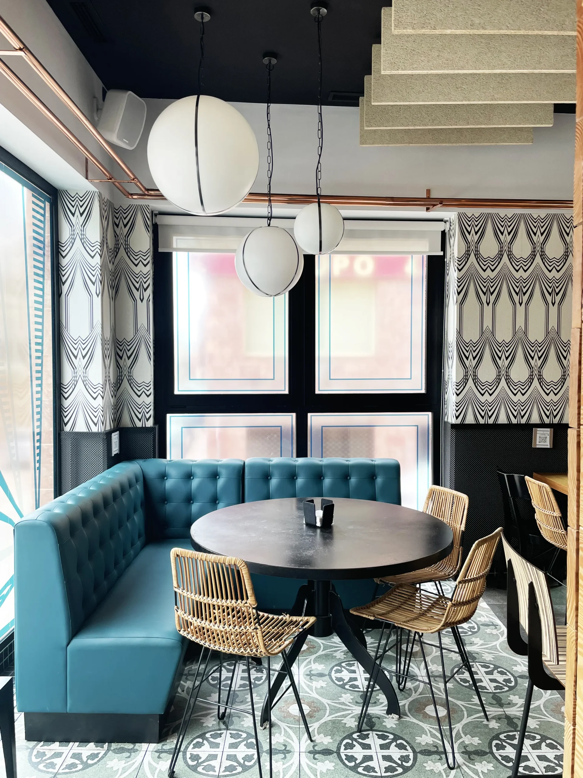 Uno de los rincones más atractivos es el espacio de sofás rinconeros tapizados en un intenso azul petróleo. La geometría de los papeles pintados en blanco y negro enmarca la zona, creando un telón de fondo que recorre todo el local.