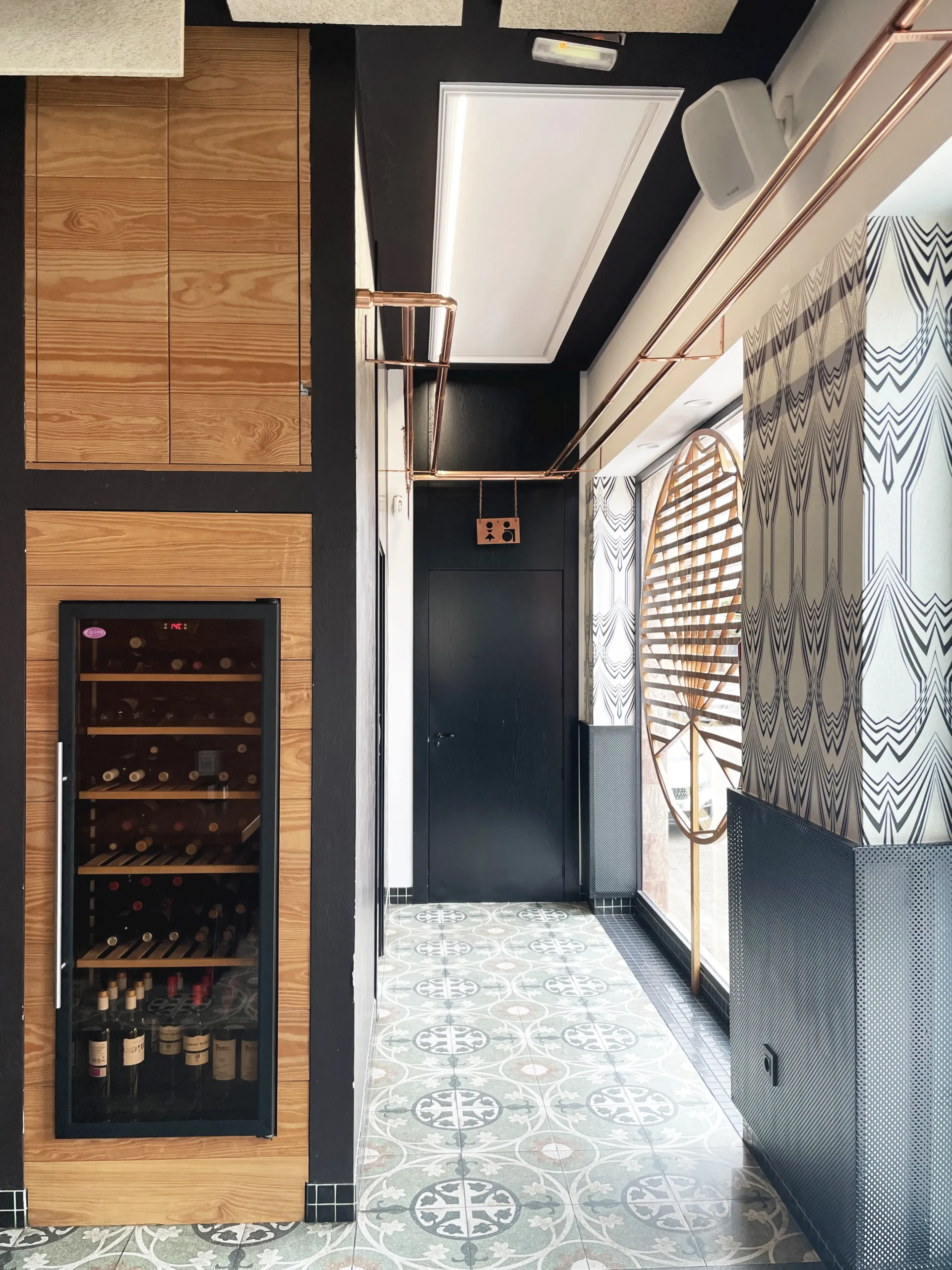 El local presentaba dos pilares en el centro del espacio que dificualtaba poder encajar una distribución funcional de las mesas en la zona de comedor. Fue por ello que se optó por unificarlos. Se convirtieron en un elemento central que generó dos espacios más íntimos y que, a la vez, sirvió como apoyo de mesas altas. Aprovechando al máximo este elemento, diseñamos un pequeño espacio oculto dentro del mismo para el almacenaje de enseres varios.