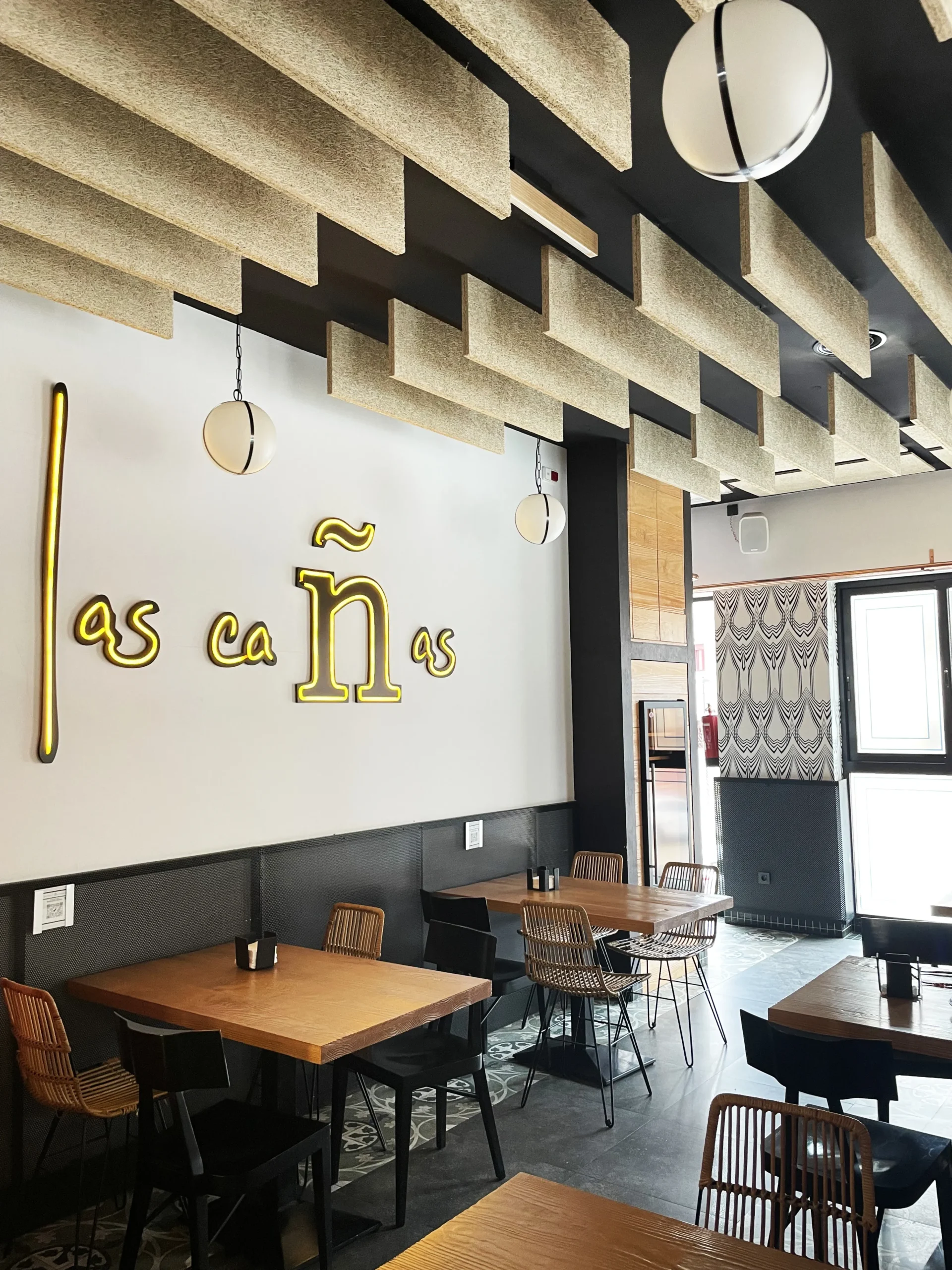 El tratamiento del techo jugó un papel fundamental dentro de esta reforma. Una problemática presente en el local era el ruido que se generaba en el mismo por la conversación de los clientes.  Se diseñó un techo utilizando paneles acústicos suspendidos, mejorando así la acústica del local y aportando cierto movimiento que lo embellece al mismo tiempo.