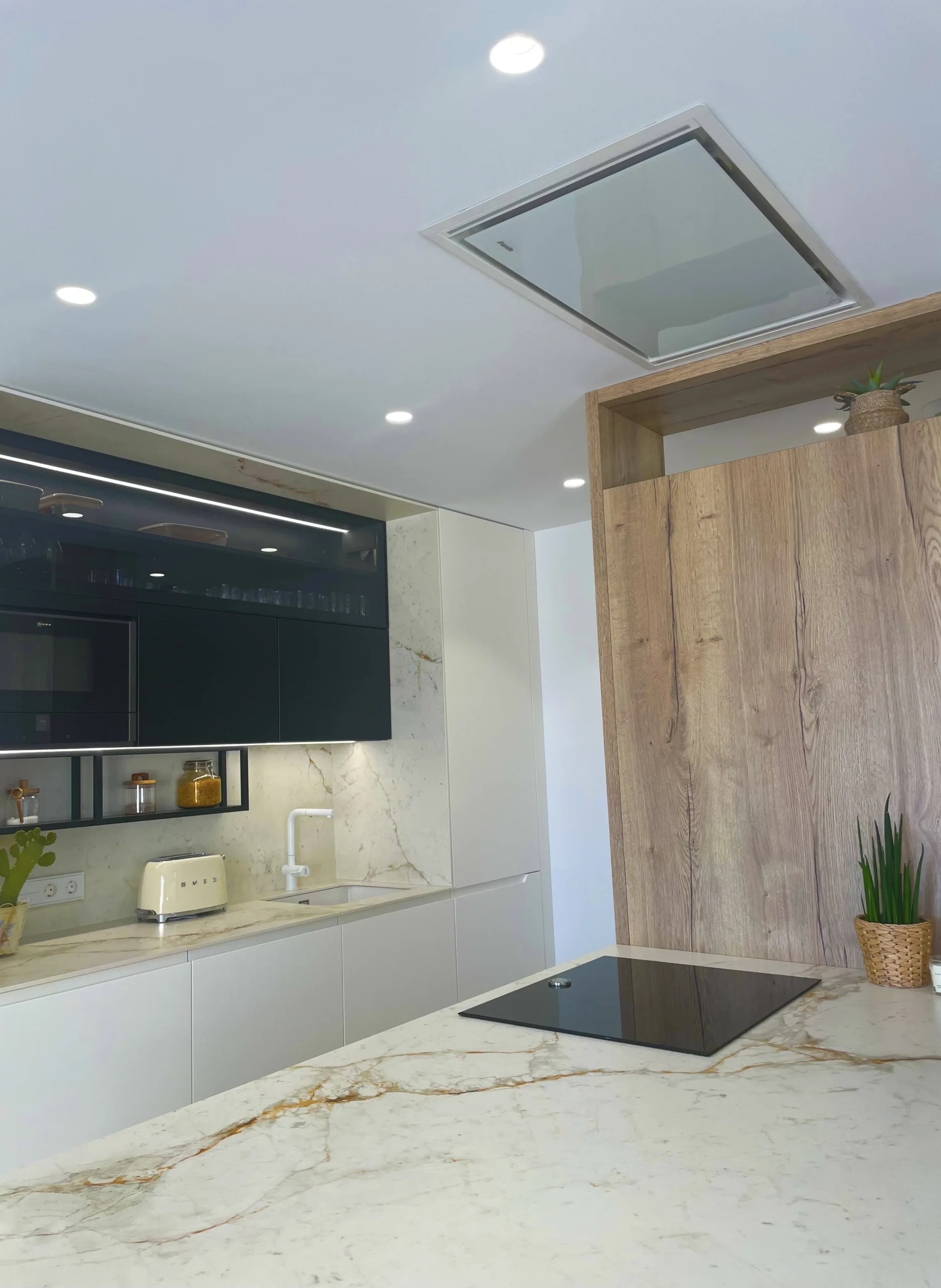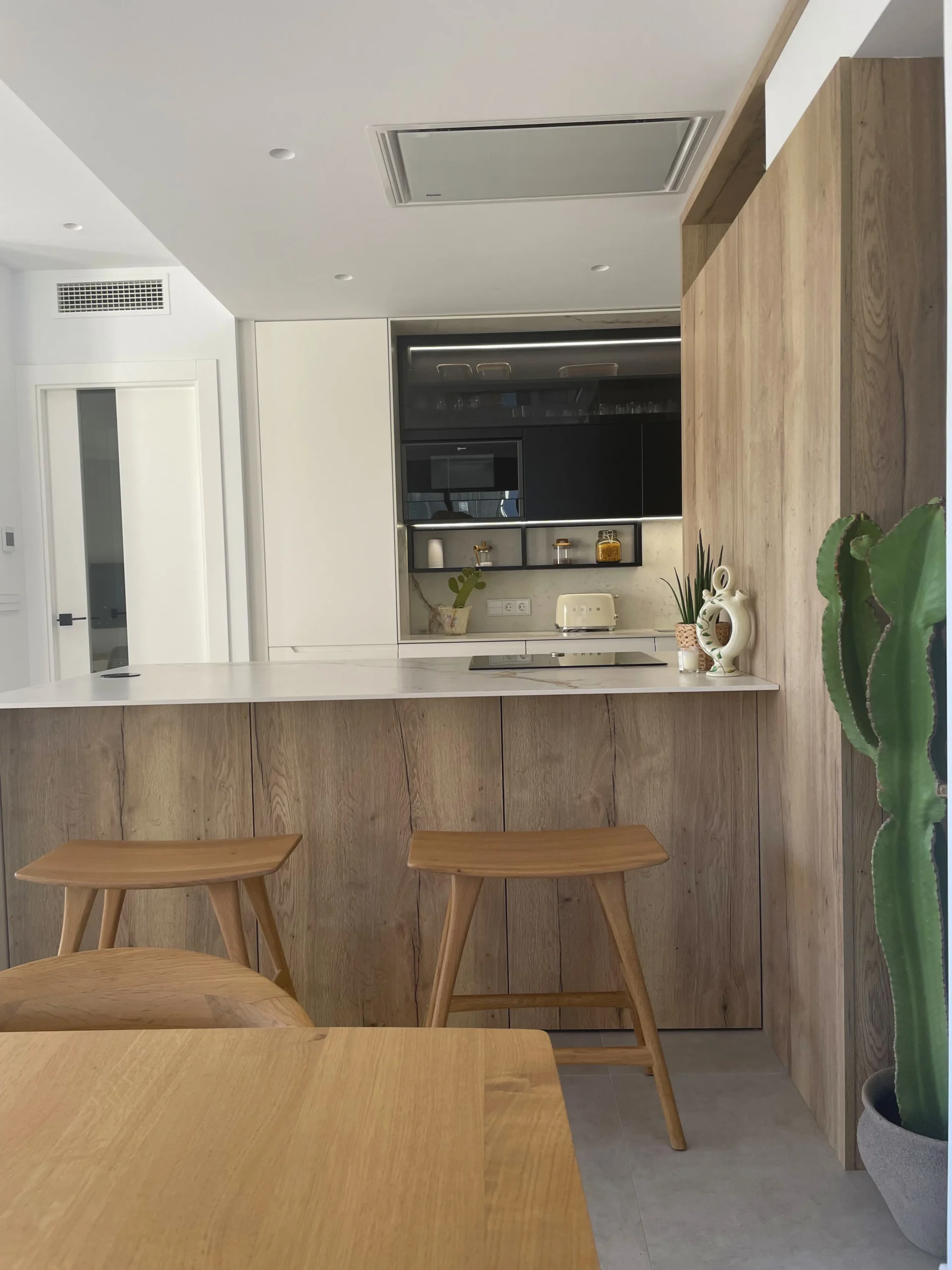 La cocina, totalmente integrada en el espacio del salón comedor, aprovecha cada rincón al milímetro, combinando funcionalidad y estilo. El lateral de la península de la cocina se convierte en un compacto lavadero que queda oculto a la zona de living.