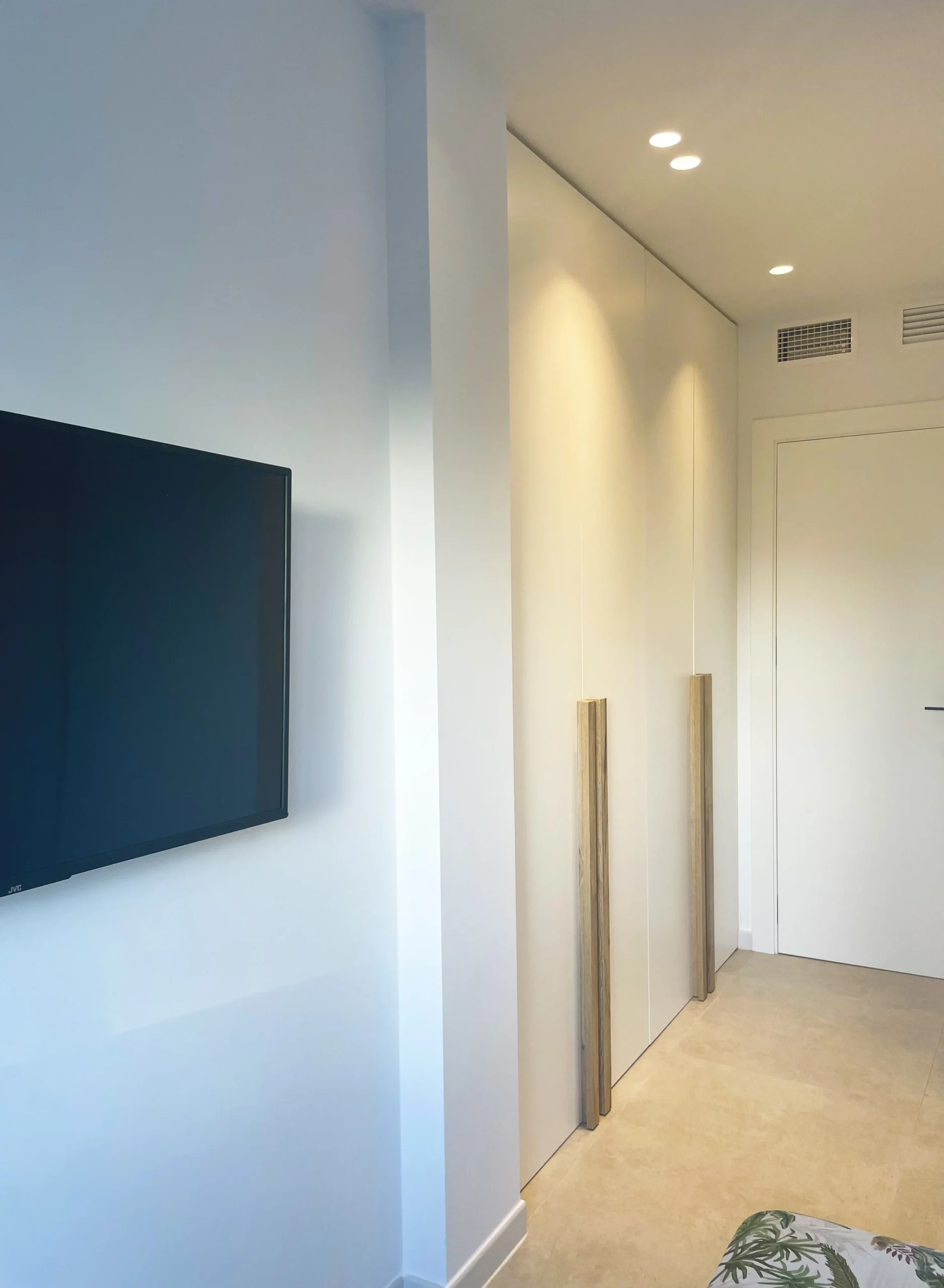La continuidad del interiorismo humanizado en los dormitorios y zonas privadas es obligatoria. Aprovechando cada centímetro de la vivienda encontramos un coqueto vestidor, que sirve de antesala al dormitorio principal. Cada rincón se convierte en una llamada a la paz y la calma, frente al bullicio diario exterior.